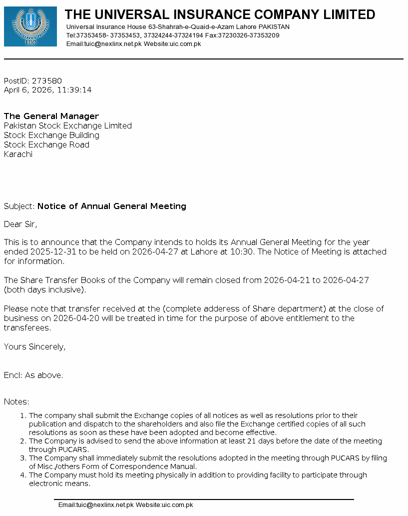 Board Meeting as on March 31, 2026 at 07-Apr-2026